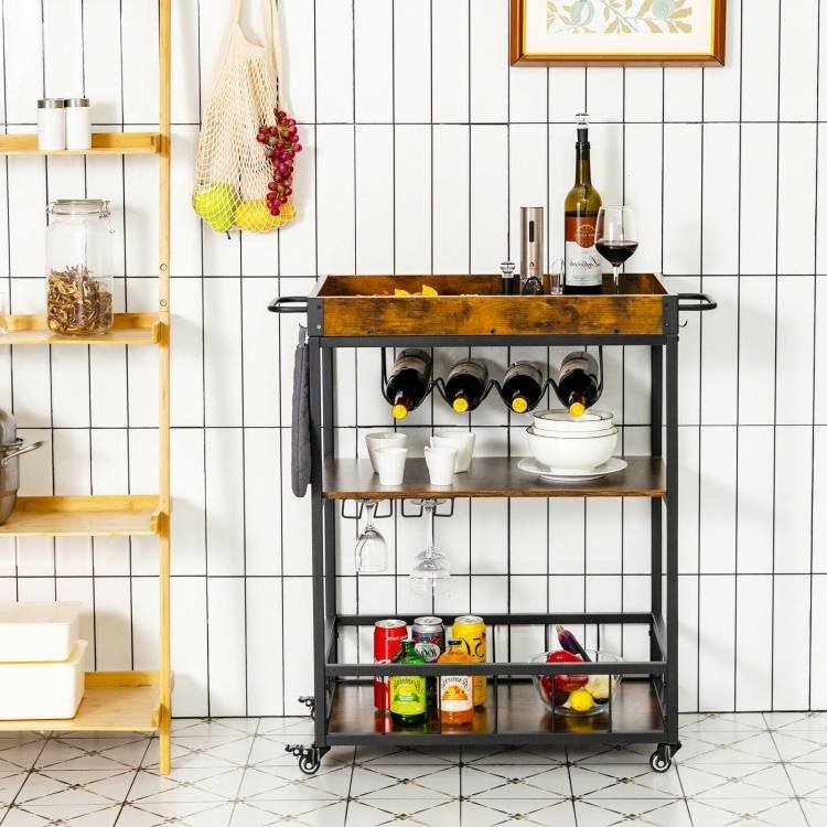 This Modern Industrial Metal Wood Rolling Kitchen Wine Rack Bar Serving Cart is capable of delivering raw ingredients and spice for preps in the kitchen. It can also transmit food and drinks to the dining room for meals. When not in use, it is also a perfect solution to store your wines, glasses and other kitchen supplies. The top tray can serve as a nice container or a prep platform for your food preps. Removable design allows you to transmit all the food inside together to somewhere else, saving time and effort. The raised edge can prevent items from falling and handles offer more convenience. The cart is constructed with a sturdy steel frame, which is solid and features a strong weight capacity. It won’t shake or wobble when you move it around and the bottom fence can avoid items falling. Selected material endows the kitchen cart great durability for long-term use. The cart is built on 4 casters to achieve smooth movement. With 2 brakes, the cart will stand stably when stopped. Meanwhile, the cart is equipped with a wine rack for 4 bottles and a goblet holder for added storage. There are 4 hooks on the side of the top tray, to help you hang the towel and others. All components are numbered and a detailed manual is included in the package. Simply following the steps listed in the instructions, you can finish the installation easily. For further use, you just need to wipe it clean with a soft cloth.